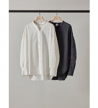 中綿入りのスタンドカラーと、袖に立体感を出したインボックス タックがポイントのシャツです。一枚で様になるディテールを入れながら、身頃と袖の素材感を変え、目を引くデザインシャツに仕上げました。エンブロイダリーレースに合わせ釦はくるみ釦を使用し、女性らしさをプラス。