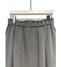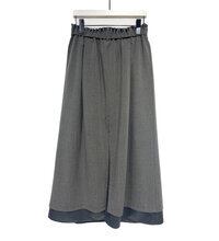 異素材をレイヤードしたロングスカートです。トラッドな素材感をモードなデザインに落とし込んだ、トレンド感のあるデザインになっています。上側はウール見えするマットな素材に、下側には光沢のある素材で、印象の異なる素材感がポイントです。深めのスリットは前中心、脇、後ろのどの位置でもご着用頂けるマルチウェイになっています。裾に向かって広がるAラインシルエットで、タックデザインがウエストまわりをカバーします。ウエストはイージー仕様です。