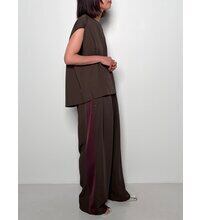 太めのラインがアクセントになったタックラインパンツです。スポーティーになりすぎず、モードに着こなしていただけます。ウエストはイージー仕様で、ポケット口のリベットもポイントになっています。同素材のブラウスとセットアップで着用すると、より綺麗めな印象になります。落ち感のある素材で着心地が良く、程よく厚みもあるので体のラインを広いすぎません。