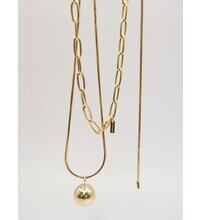 程良いボリューム感と抜け感のあるオーバルチェーン&取り外し可能なメタルボールが付いたスネークチェーンの2本セットネックレスはどんなコーデにも合わせやすく、それぞれサイズ調整も可能な万能アイテムとなっております。オーバルチェーンはお好きな位置で留められるのでショートやY字にしても◎メタルボールは取り外し可能で、スネークチェーンにスライドビーズがついているので着用しながらの長さ調節が可能です。2本重ねて着けたり、単体でつけたりと様々な着け方を愉しめます。メタルボール裏面に「CHIGNON」刻印入り。