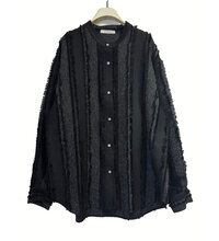 目を引く素材感のカットジャガードは、ストライプ柄の際がフリンジになっており、一枚羽織るだけでスタイリングのポイントになります。