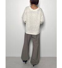滑らかな落ち感のある素材感と、ほんのりと膝を入れたワイドフレアシルエットで、上品な印象に。
