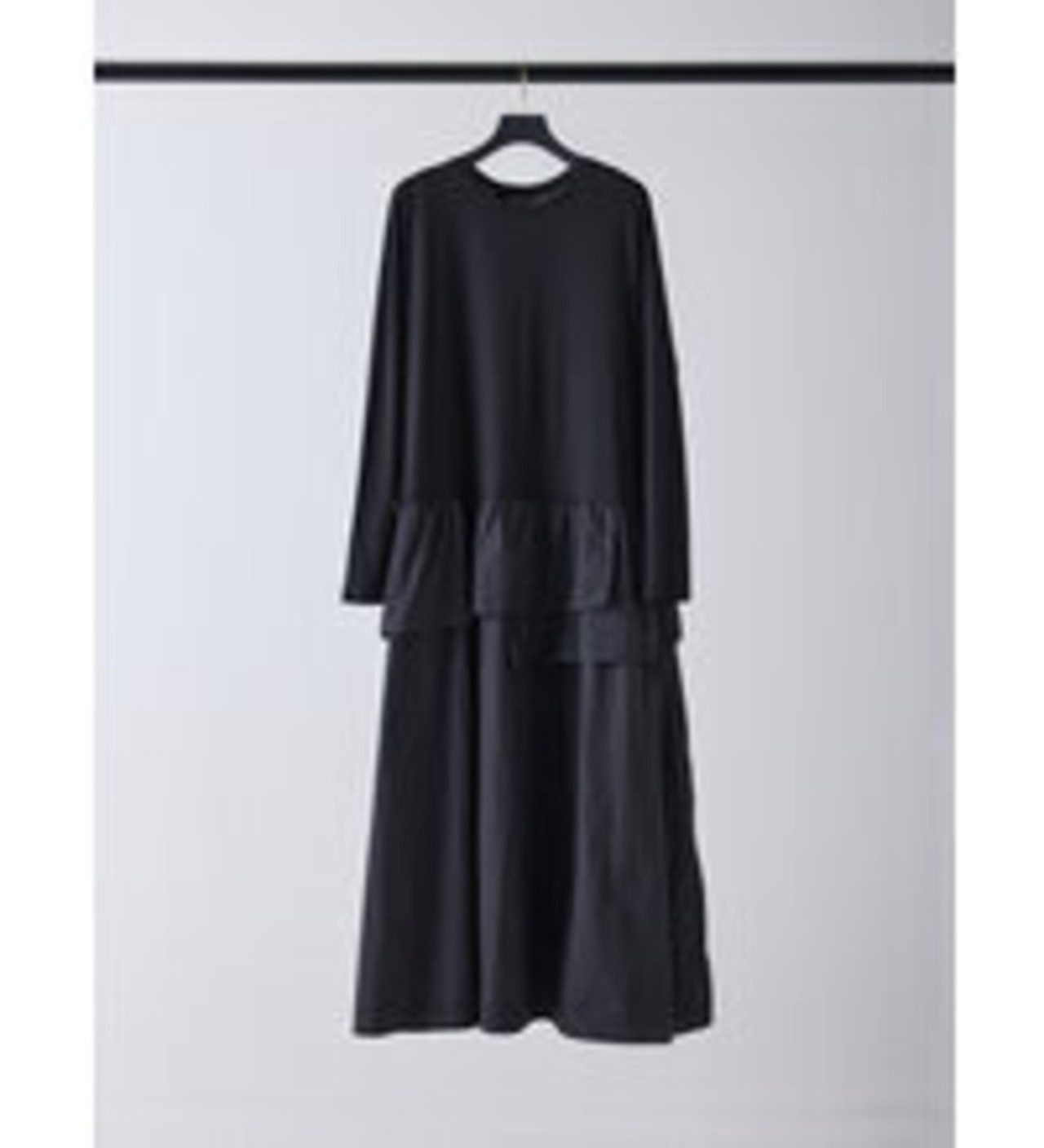 トップス部分は肌触りのよいカットソー素材でリラックス感を、スカート部分にはしなやかでハリのあるタフタ素材を合わせ、甘さを抑えたモードな印象に仕上げました。
