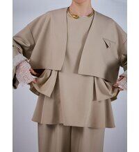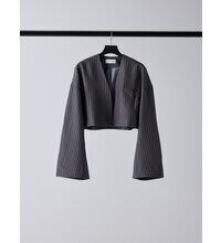 すっきりノーカラーで仕上げたボレロジャケットは、バストや肩幅にゆとりを持たせた設計で、着るだけでモードなバランスが手に入る一枚。
