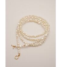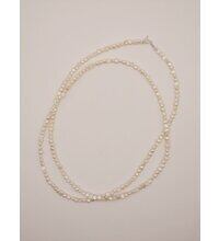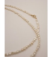 小粒なバロック淡水パールネックレスは、1連や2連にしてつけたり、前で結んで垂らしたり、Y字にしたりと様々な付け方を愉しめます。オリジナルのマンテル金具はチェーンの華奢さを邪魔しないよう極小サイズで製作しています。0056-520SHのロング2チェーンネックレスにも同じマンテル金具を使用していますので、それぞれ2本を繋げてぐるぐるとミックス巻きすると首元が一気に華やかに◎小粒な淡水パールはオケージョンやパーティシーンはもちろん、普段使いもしやすいアイテムです。