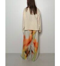 パンツ全体に大きくぼかし風の花をプリントし、全体的に抽象的なアートのような柔らかい印象。