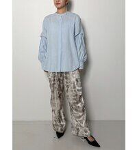 前後どちらを前にしてもご着用して頂ける2WAY仕様で、釦あき側を前にするとすっきりとした比翼、プルオーバー側を前にするとネックにギャザーが施されたフェミニンなデザインになります。全体的にほどよくゆとりのあるシルエットで、ヒップが隠れる着丈なので体型もカバー出来ます。少しピーチスキン調な生地は、柔らかさとハリを併せ持った素材感なので、シャツのシルエットが綺麗に出ます。