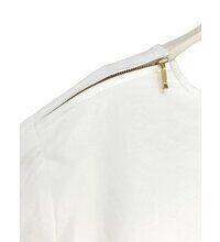 ちらりと見える肩の金属ファスナーがさり気ないアクセントになっています。