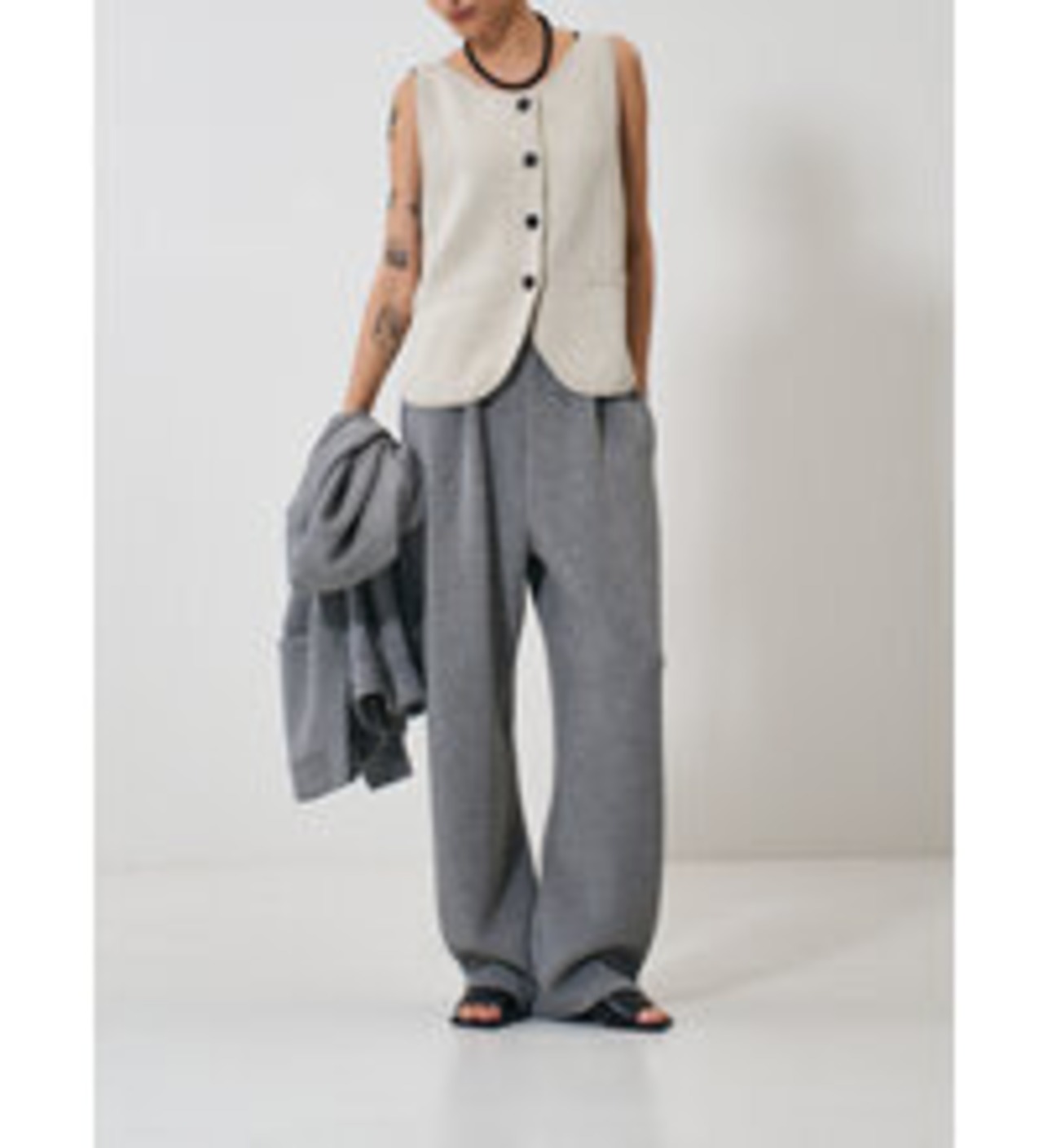 前あきのマニッシュな印象のベストに、デコルテをあけたボートネックを採用することで、女性らしさをプラスしました。綿糸のナチュラルな風合いが懐かしさと柔らかい印象を与えてくれる、レイヤードのスタイリングを新鮮にアップデートしてくれる1枚です。