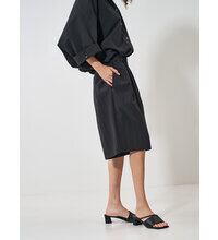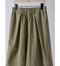 前後に深く入れたタックデザインで作るふんわりとしたシルエットがポイントで、ボーイッシュになりがちなアイテムに女性らしさをプラスしました。ウエストゴムのリラックス感のある仕立てで、ベルト裏の紐で絞って着用いただけます。