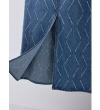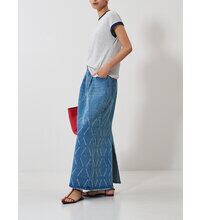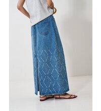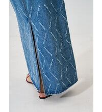 レーザー加工で表現するオリジナルパターンが特徴のデニムナロースカートです。