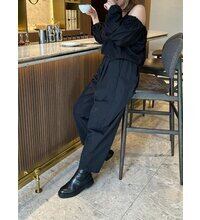 パンツはナイロン素材のカーヴィーシルエットで、モードな抜け感を演出。