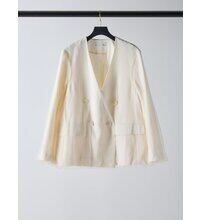 リネンライクな素材のノーカラージャケットに、ふわりとチュールを重ねた“春のはじまり”にぴったりな一着。