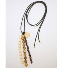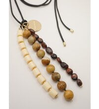 大人配色の組み合わせが目を惹く天然石ネックレスはコードを取るとバッグチャームとして使えるのも嬉しいポイントです。天然石は間にビーズや丸カンを挟め間隔を出すことでより洗練されたデザインに仕上げています。結び目で長さ調節が可能なのでトップスに合わせてお好きな位置に着けられます。また、モチーフは取り外し可能なのでコードのみチョーカー風に使用することも可能となっております。丸プレートには「CHIGNON」の刻印入り。