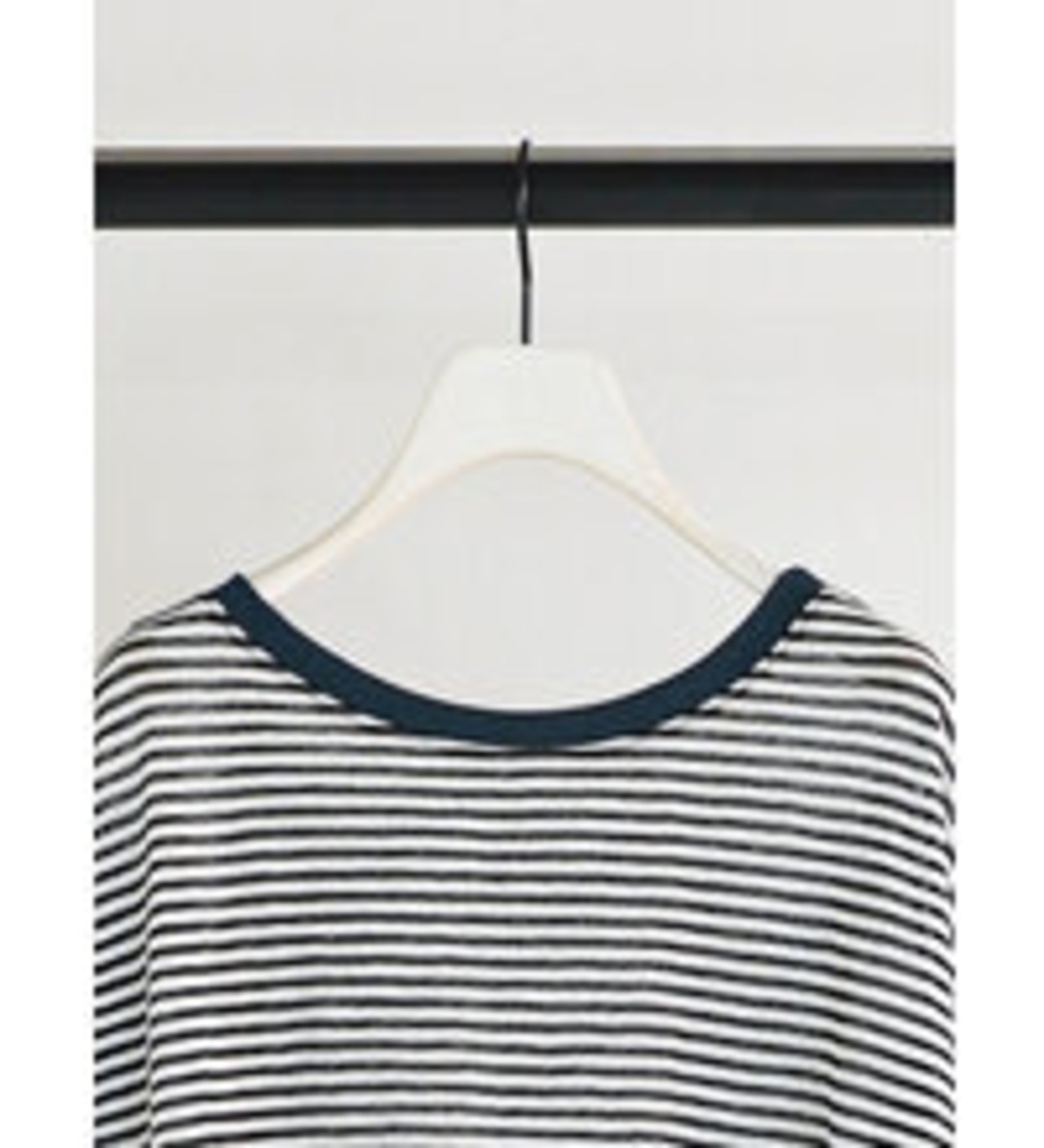 以前ご好評を頂いておりましたシアーボーダーカットソーをリバイバル。配色の衿がトレンド感を増し、さらに”今っぽい”1枚に仕上がりました。程よいシャリみと透け感がスタイリングに軽さを出し、春ムード全開に。