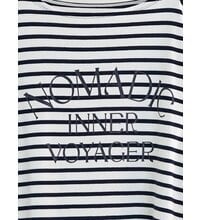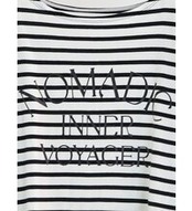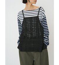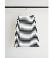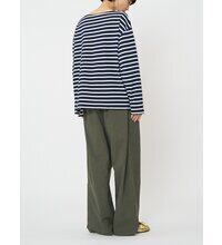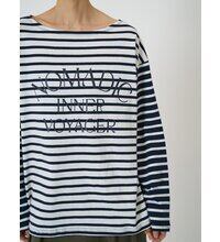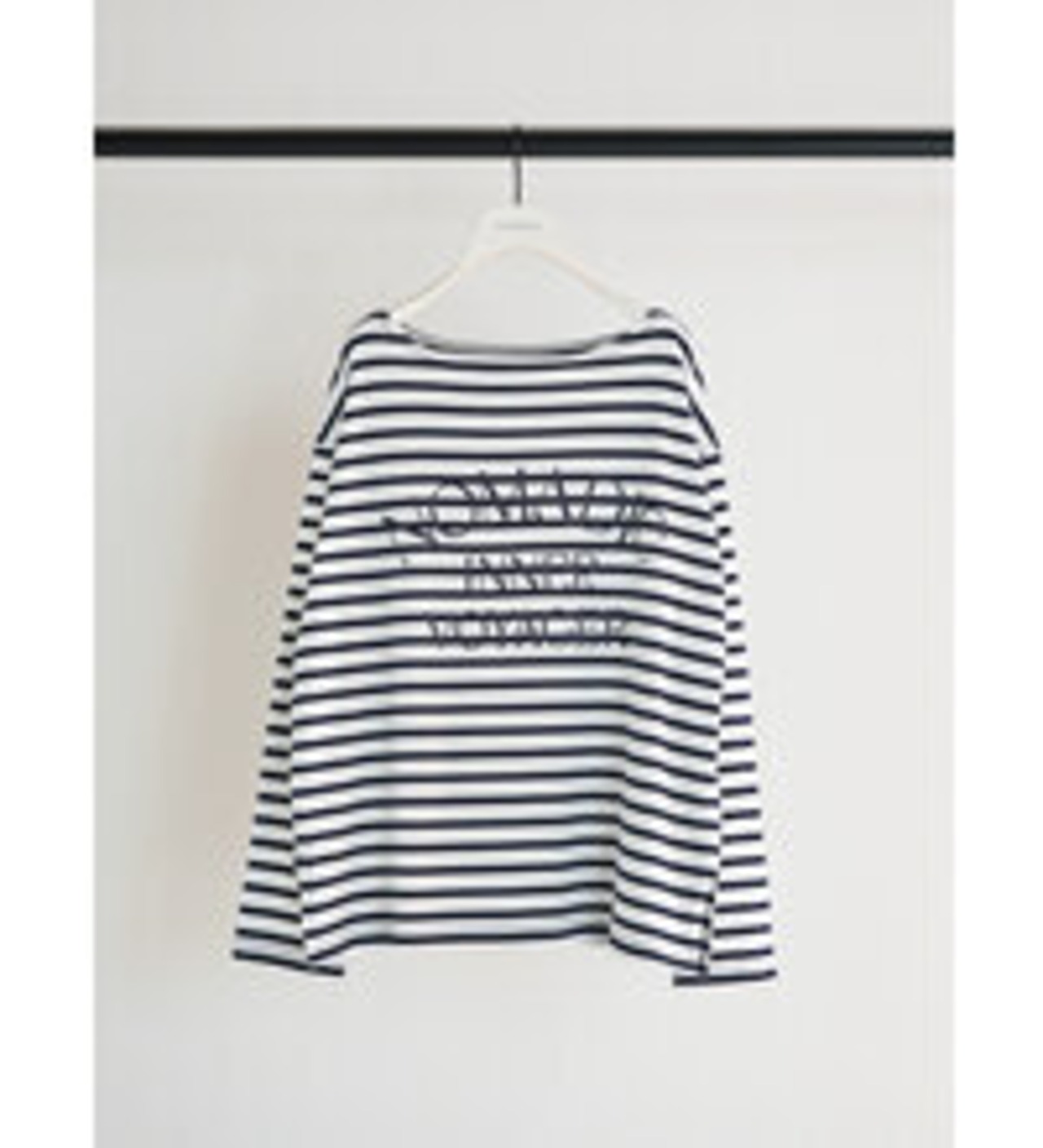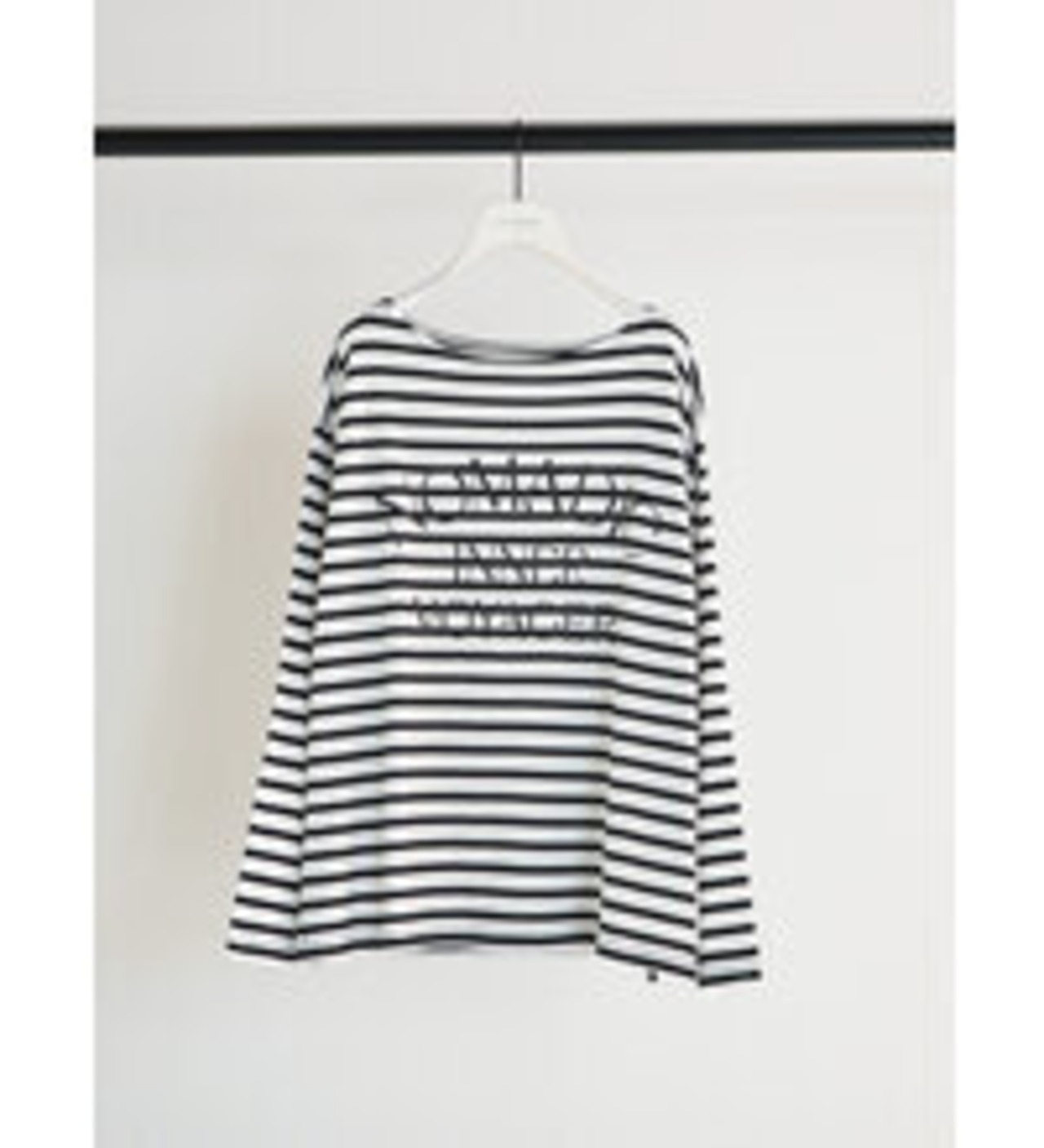 ボーダー×ロゴの掛け合わせが、程よくカジュアルな印象を与え、1枚でコーディネートが決まりやすい万能TOPS。プリントの色がボーダーと同色なので、そこまで主張せずモードな雰囲気にまとめました。シャツやジャケットのインナーとしても映えること間違いなし。