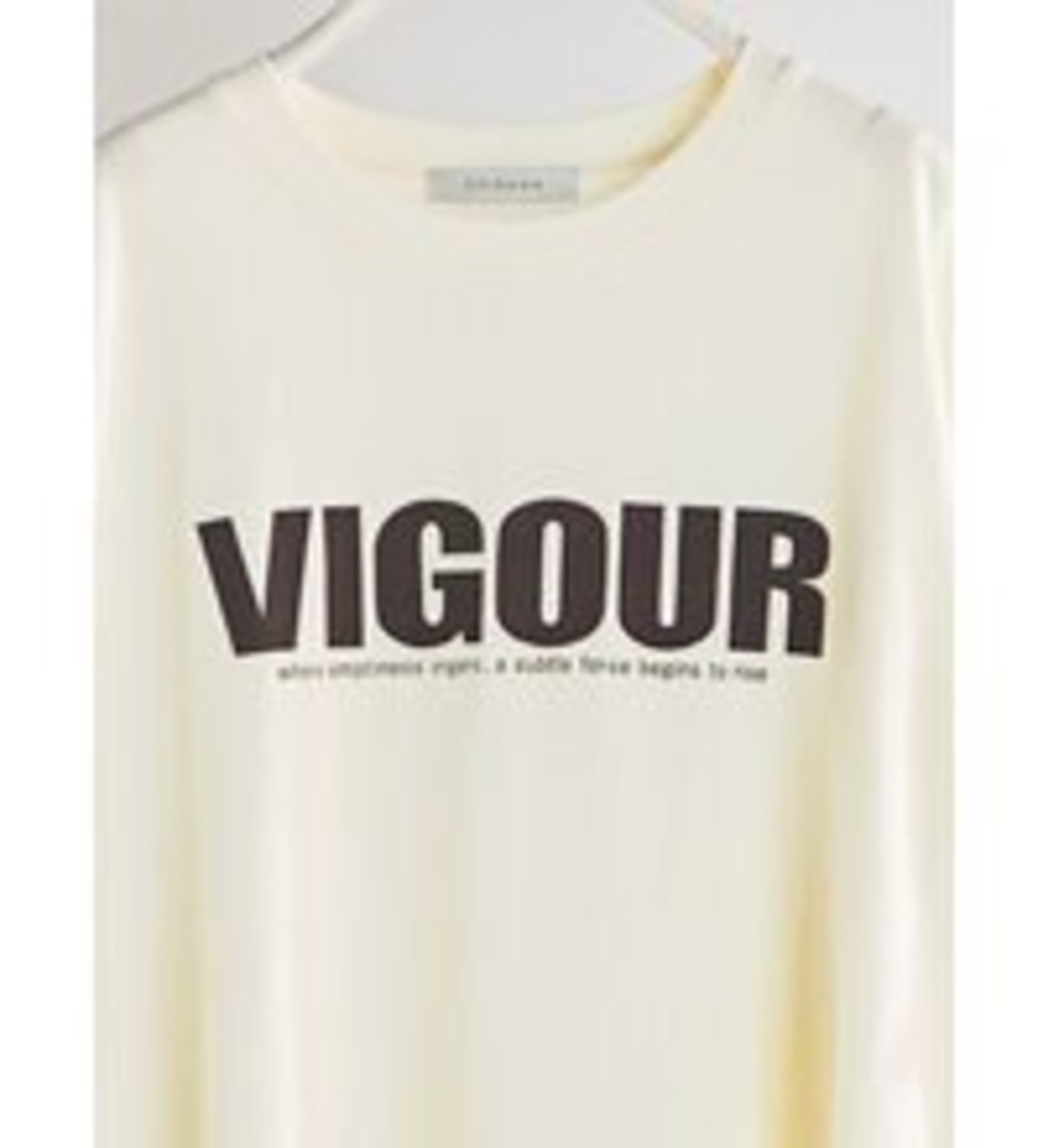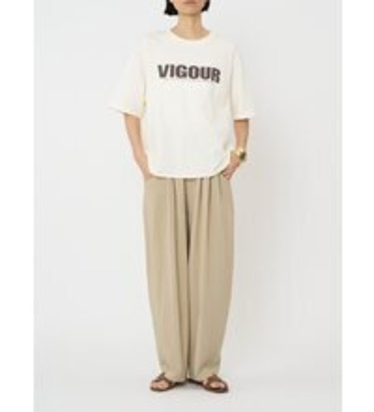 ロゴのインパクトが目をひくシンプルなカジュアルプリントTee。VIGOUR=活力、エネルギーという意味はポジティブで力強い印象を与えます。さりげない後ろ身頃のポイントマークはエネルギーの螺旋をイメージ。素材はしっかり感と柔らかさのバランスがよいサラっとタッチの天竺をセレクト。透ける心配もなく、体のラインも拾いにくいです。通年のデイリー使用にちょうどいい1枚に。