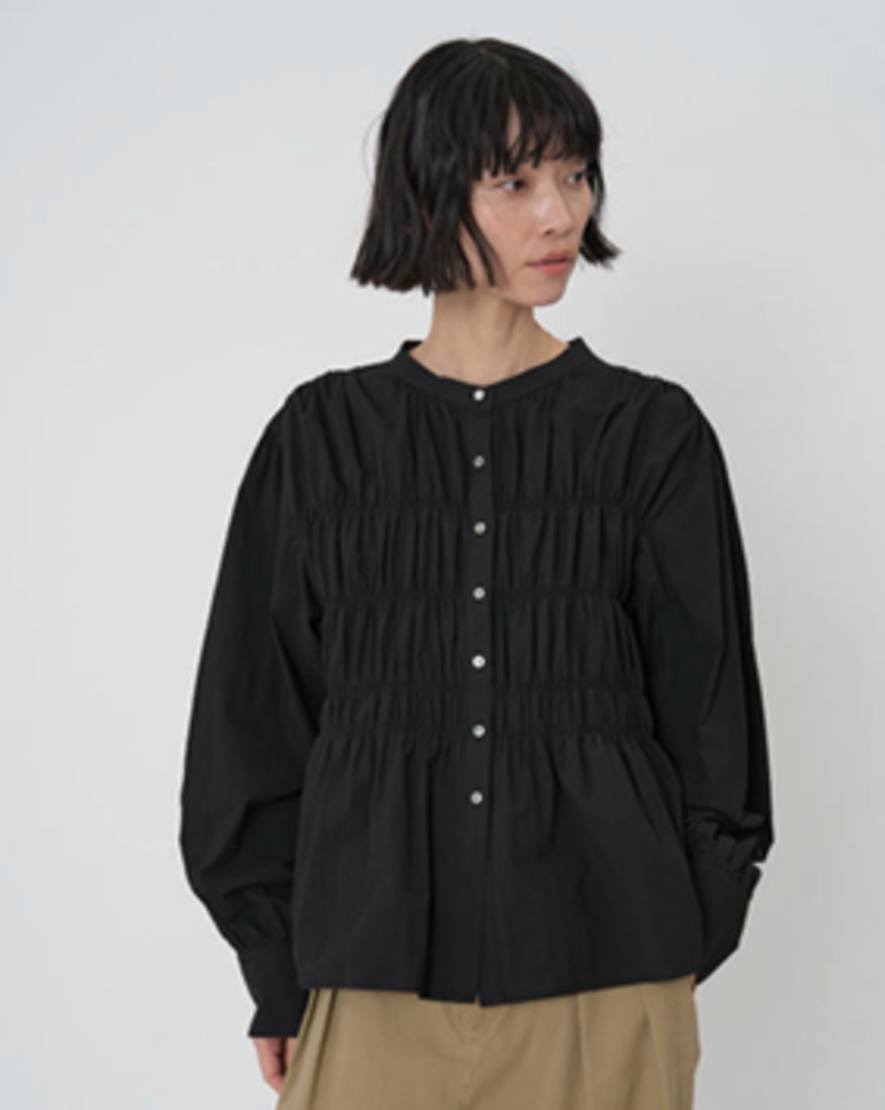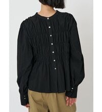 コットン素材を使用した、シャーリングデザインのブラウス。