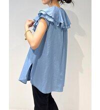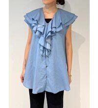 3オンスの薄くシアーなデニム生地を使用した、軽やかなラッフルカラーブラウス。