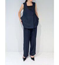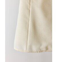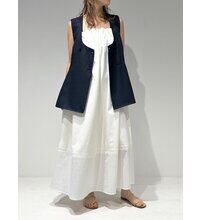 ワントーンで織り上げた、表情豊かなスクエア調サマーツイード素材のジレ。立体感のある生地がシンプルな装いにも奥行きを与え、上品な存在感を放ちます。大きめのUネックが程よいやわらかさと抜け感を演出し、ジレ特有のかたさを抑えた印象に。裾にかけてほんのりフレアを効かせることで、柔らかなシルエットを描きながら下半身をすっきりと見せてくれます。フラットな貝調ボタンがモードなアクセントとなり、ポケット付きで実用性も備えています。同素材シリーズのパンツと合わせたセットアップスタイルもおすすめの一着です。