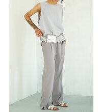 夏に重宝するシンプルなオーバーサイズのノースリトップスですが、袖口の切り替えラインや衿口のデザインなど、所々にポイントを散りばめました。 メンズライクなアイテムですが、女性らしい柔らかな色展開にしているので、大人カジュアルスタイルにぜひ取り入れてほしい1枚です。