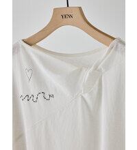襟元に生地をツイストしたデザインを施し、さりげない肌見せを叶えるフレンチスリーブトップス。控えめに開いたネックラインが、大人らしい抜け感を演出します。袖口はややふんわりとした仕様で、女性らしい柔らかさをプラス。落書きのようにラフなプリントに、ハンドステッチ風の刺繍を重ねることで、贅沢感と程よい抜け感を併せ持つグラフィックに仕上げました。背中にはYENNのロゴをモチーフにしたプリントを施し、後ろ姿にも抜かりのないアクセントを。すっきりとしたシルエットのパンツと合わせるだけでなく、両脇のベンツ開きを活かしてフロントのみボトムインするなど、幅広いスタイリングが楽しめる一着です。