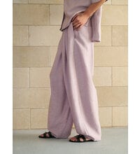 落ち感のある素材に、畝のような凹凸を持たせた表情豊かなカービィパンツ。さらりとした肌触りで肌離れも良く、暑い季節も涼やかに着用いただけます。カーブを描くカッティングで丸みのあるシルエットを表現し、とろんとした素材感がその立体的なフォルムを美しく引き立てます。ボリューム感がありながらも、裾にかけて自然にテーパードを効かせることで、足元はすっきりとシャープな印象に。存在感がありつつ、バランス良く着こなせる一本です。
