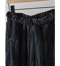 マニッシュなスクエア柄レースが印象的なレースパンツ。凹凸感のある素材表情がスタイリングに奥行きをもたらします。ウエストベルトとポケット口には切りっぱなしのパイピングを施し、程よくラフでこなれたムードを演出。ウエストには紐が付いてい調整可能です。裾部分にはカットオフディテールを取り入れ、軽やかさと抜け感をプラスしました。レース素材でありながらも甘さを抑えたデザインで、シンプルなトップスと合わせるだけで洗練された着こなしが完成する一着です。