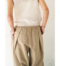 前後に深く斜めにいれたタックで作るカーブシルエットになっていて、肌に張り付かない涼しく履けるメンズライクな印象のパンツに仕上げました。 ゴムパンツとは違った、イージーながらもすっきりと履き込めるのがうれしいポイントです。