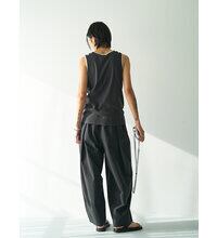 アメリカンコットン100%のクリーンな質感を活かした、アシンメトリータンクトップ。2枚のタンクトップをレイヤードしたような構築的デザインが、シンプルながら奥行きのある表情を演出します。外側のタンクトップは斜めにカットしたヘムラインと、わずかにずらしたネックラインが印象的。配色バインダーでトリミングしたタイプと、あえて配色を省いたミニマルなタイプを含む3色展開で、それぞれ異なるムードを楽しめます。胸元にはYENNのジャガードニットネームを配し、さりげないアイコニックなアクセントに。インナーとしてはもちろんトップスとしても活躍する1着です。