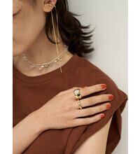 独特な光沢を放つマザーオブパールを施した2本のデザインリングは、力強い女性らしさとモード感が漂う2WAYタイプ仕様に仕上げております。幅広リングは存在感のあるカボションと反対側は斜めに切り込みを入れたようなデザイン、細リングは小さなカボションと開き口を真横に取ったデザインに仕上げています。リングのどこを前にしても違った見え方が楽しめる仕様となっておりますので、その日の気分によって着ける位置を変えれるのも嬉しいポイントです。天然パールは天然素材の為、一つ一つ色味やサイズに若干の個体差が生じますので予めご了承下さい。リング内側には「CHIGNON」の刻印入り。マザーオブパール意味:包容力・健康・長寿・癒し・安らぎ・母性