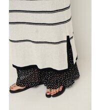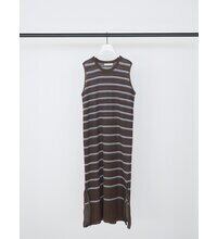 ボーダーのピッチを少しずつ変化させ、上半身はすっきりと、裾回りは大胆にみえるようにオリジナルでボーダーを組んでいます。2×1のリブ組織なので、体のラインを拾いすぎずにスッキリとしたシルエットになっています。