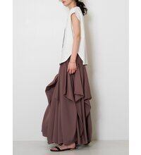 素材は程よい厚みの20天竺をセレクト。肩にかかる絶妙なフレンチスリーブ風シルエットで、二の腕をさりげなくカバーしつつ、抜け感のある印象に。裾はラウンドカットで、アウトしてもバランスよく決まります。夏から秋にかけてカジュアルに使える大人の万能TOPSです。