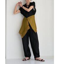 お勧めの着こなしは中央の接ぎ線で二つに折り、釦で止めて腰に巻きスカート風に!