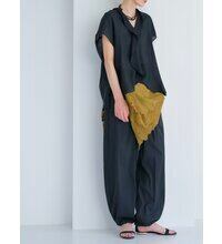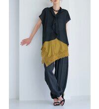 前後差のある着丈でタックインしやすく、ワイドパンツやテーパードパンツにさらりと合わせるだけで、ニュアンスのあるモードスタイルが完成。