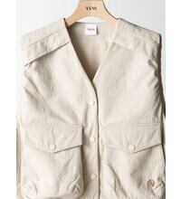 レザー調のエンボス素材を使用した、PUFFY MILITARY VEST。表面はさりげない凹凸感のあるレザーライクな質感。ハードになりがちなミリタリーデザインを、上品な印象へと引き上げます。裏側にはカットソー素材をボンディングし、中綿なしでもふんわりとした立体感を実現。やわらかな着心地で身体になじみ、衿まわりも優しい印象に仕上げています。イージーケアでご自宅でのお洗濯が可能なのも嬉しいポイントです。ポケットはフラップ付きのビッグポケット仕様。存在感がありながら、サイドからも手を入れられる実用的なデザインに。カジュアルな中に、絶妙なふんわり感が大人の可愛らしさをさりげなく引き立てます。背中ヨークにはベンチレーション機能を採用。さらにメッシュ裏地を使用することで、肌当たりの良さと通気性を確保しました。残暑の時期から快適に着用いただけます。細部までこだわり抜いた、存在感のある一枚。