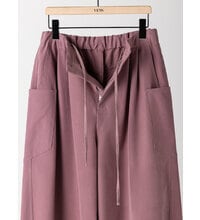 上質なドレープ感と微光沢のあるレーヨン混のツイル生地を使用。女性らしい素材感とマニッシュな雰囲気がMIXされた大人のカジュアルパンツに仕上げました。脇に施したビッグポケットデザインは、ヒップを程よくカバーすることで小尻効果に。とにかく大容量のポケットで、仕事で使用する書類やペットボトルなど、通常のパンツでは入らないような物も収容できるので、実用的なのもうれしいポイントです。ウエストはALLゴムのファスナー開き仕様、ベルト裏に紐をとおしてあるので、さまざまなサイズに対応できるよう設計しています。裾は靴の上で止まるように少し小さめにしてあるので、裾を引きずりにくくなっています。