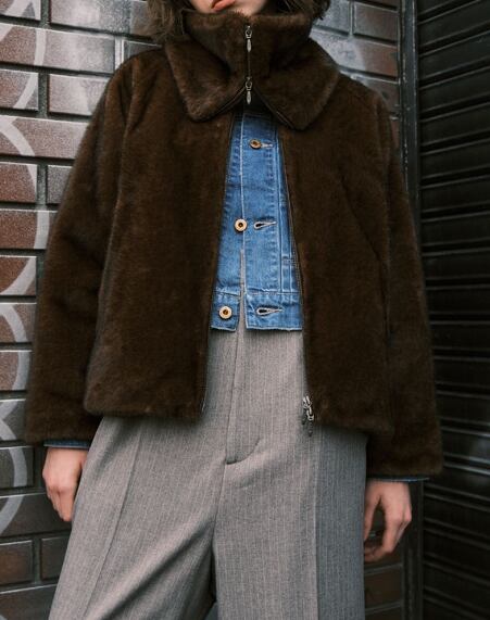 フロントはダブルジップ、ファスナーにレザーテープを挟み込んでファーが噛みにくくしています。
