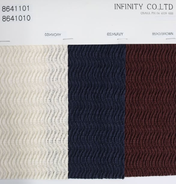 綿とポリエステルの収縮差を利用して凹凸感を出し、ポリウレタンでさらに伸縮性を持たせた素材です。