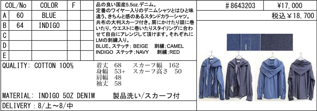 【ご予約品】《LE MELANGE》INDIGO 5OZ DENIM #8643203【送料無料】 納期 8/上~8/中