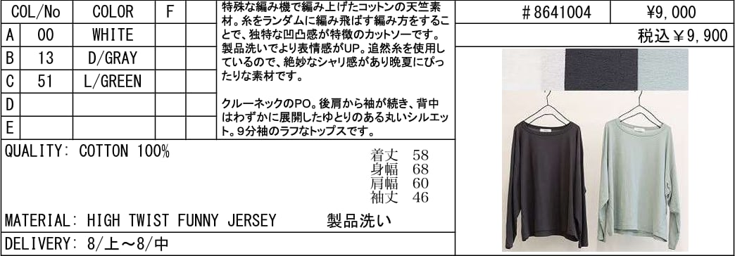 【ご予約品】《LE MELANGE》HIGH TWIST FUNNY JERSEY #8641004 納期 8/上~8/中