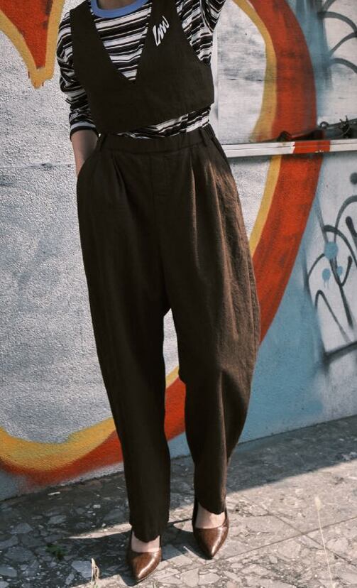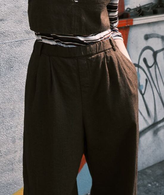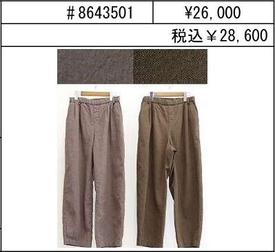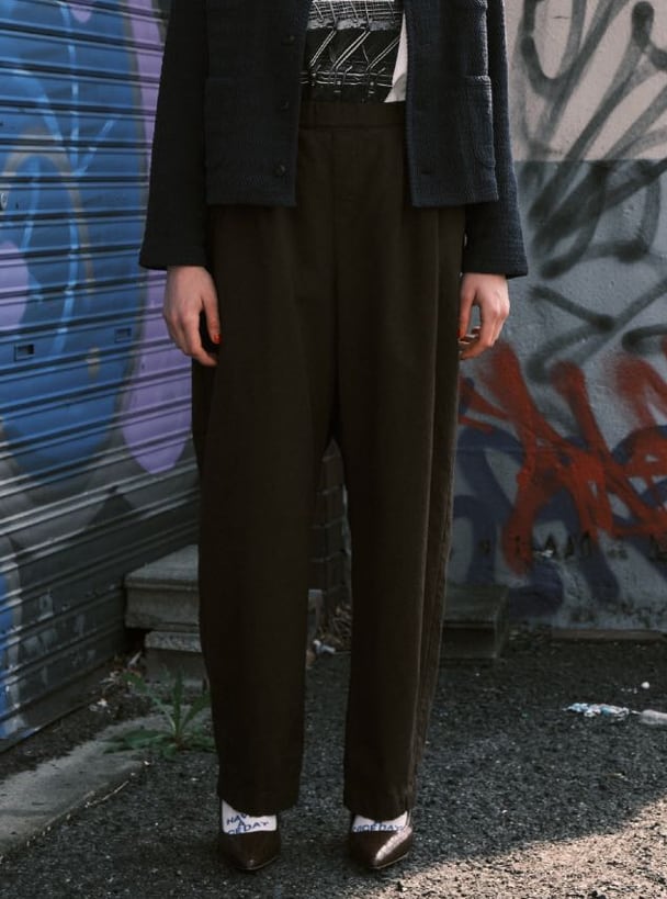 フロントの2タックとウエストぐるりゴムひも仕様のゆったり設定のパンツ。