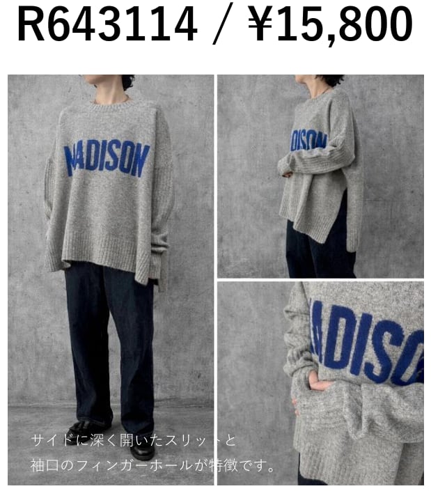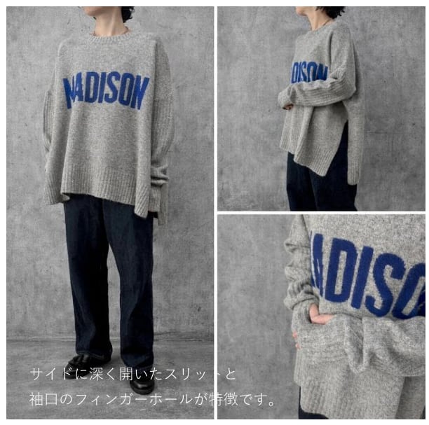 袖口がフィンガーホール(指あき)仕様なのとドルマンシルエットが特徴のロゴニット。