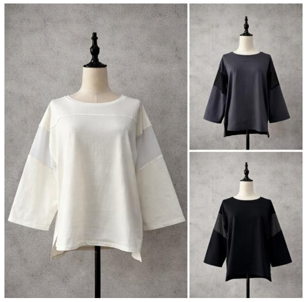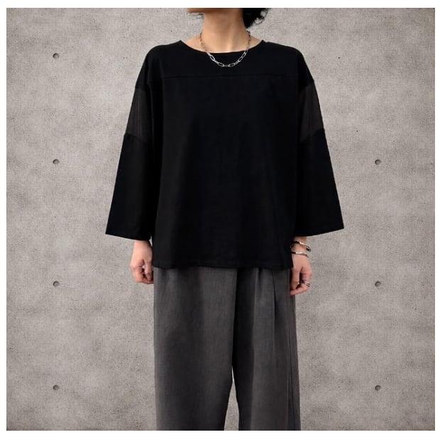 袖を同色のシアー感ある素材で切り替えて、抜け感をプラスしました。
