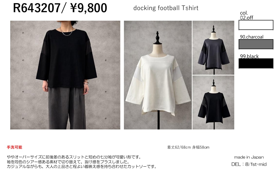ややオーバーサイズに前後差のあるスリットと短めの七分袖が可愛い形です。