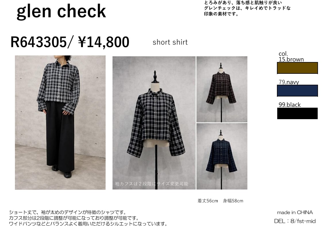 とろみがあり、落ち感と肌触りが良いグレンチェックは、キレイめでトラッドな印象の素材です。