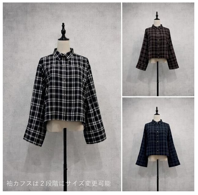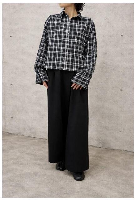 ショート丈で、袖が太めのデザインが特徴のシャツです。