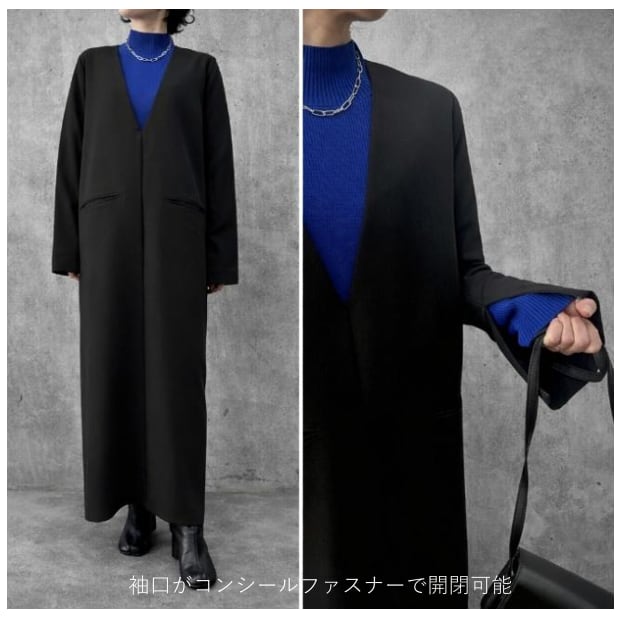 袖口に施されたファスナーで、インナーやアクセサリーでアクセントをプラスしたり袖のシルエットに変化をつけたりも可能で様々な着方の出来る一枚です。
