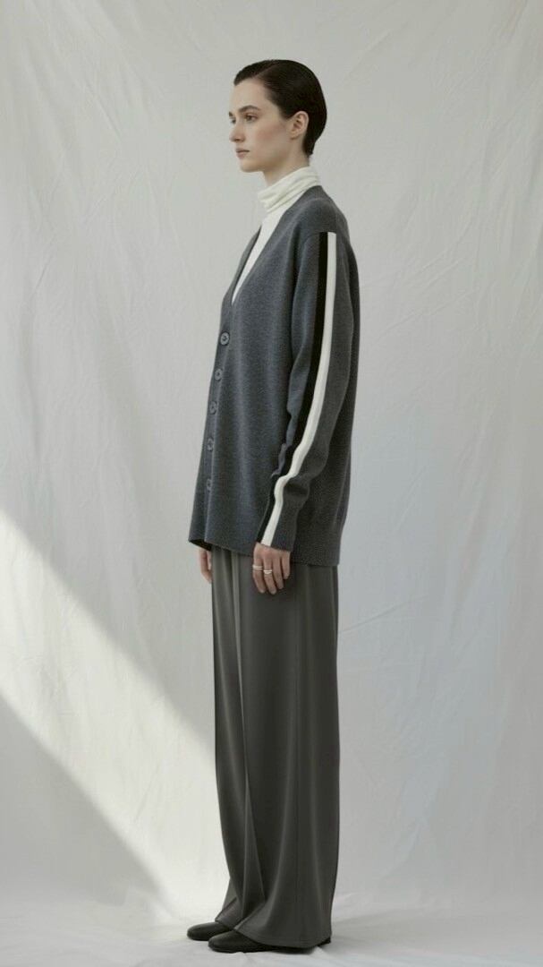 ヤク×メリノウールの柔らかな⾵合いが⼼地よい、ショルダー配⾊ラインカーディガン。