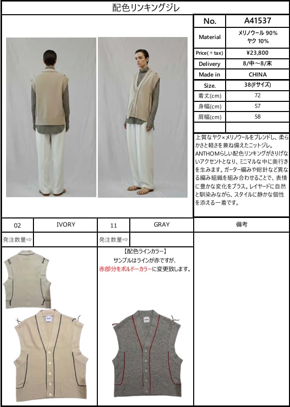 【ご予約品】《ANTHOM》配⾊リンキングジレ [A41537]【送料無料】 納期 8/中〜8/末